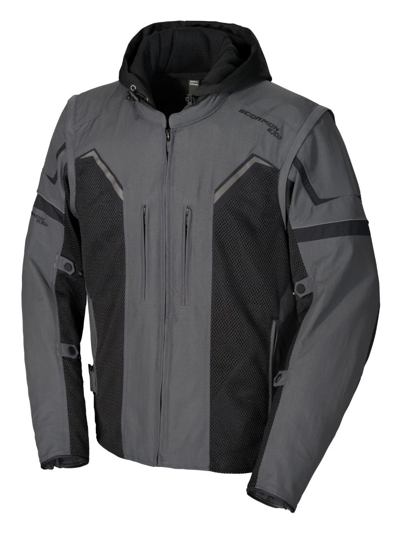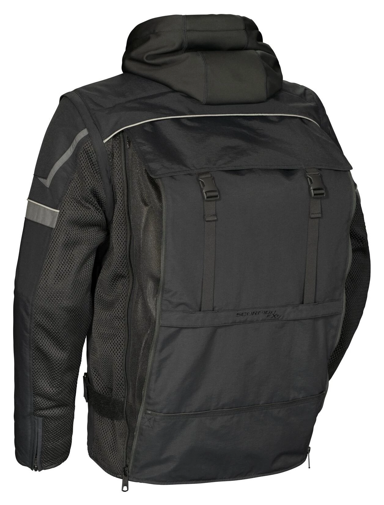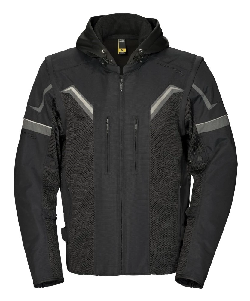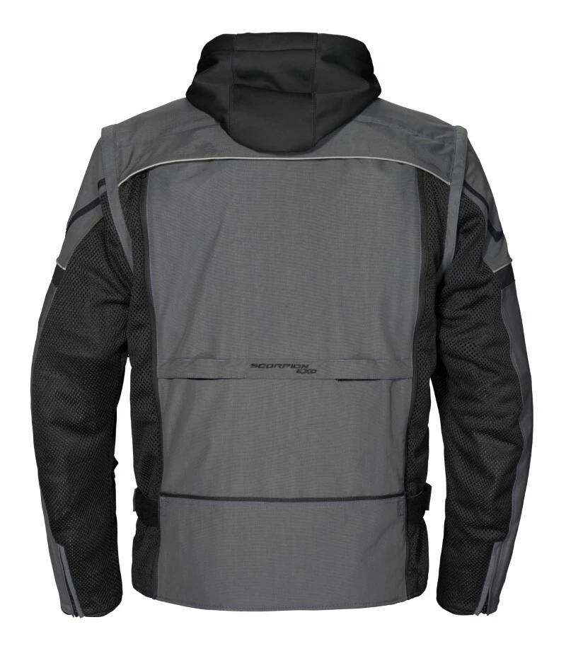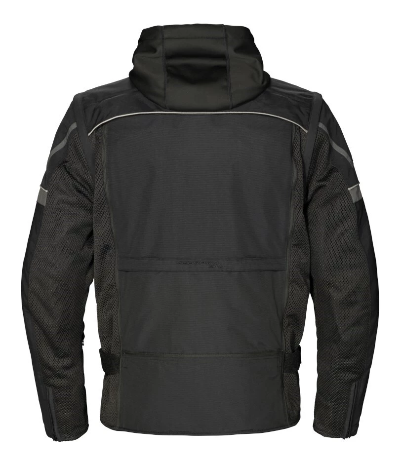 The Scorpion Transformer Jacket can combat any weather condition. When temperatures start to drop bundle up with the polyester windproof softshell hoodie that zips directly into a 600D premium nylon shell. During warmer months transform this jacket into a stylish vest by zipping off the sleeves. A tuck away panel on the back provides even more airflow with an extra storage pouch to keep the sleeves and jacket together.